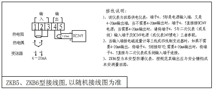該表是一款回路供電儀表,其電源接線端帶有4~20mA變送輸出,可與二次儀表或DCS、PLC系統(tǒng)構(gòu)成安全區(qū)測(cè)量顯示或控制系統(tǒng)。