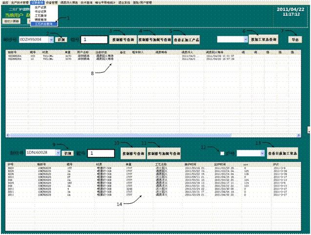 該界面用于查詢工件在整個(gè)工藝加工過程中的情況,及加工各步的時(shí)間,。查詢工件工藝在哪臺(tái)設(shè)備上加工。